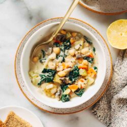 This lemon chickpea stew features 11 different plants which is sure to help you easily reach the 30 plants per week goal. If you don’t know what I’m talking about, there was a study done by The American Gut Project that concluded people who eat at least 30 different plants per week have a more diverse microbiome than those who don’t. Which means that warming up with a bowl of this stew not only tastes good but is also helping to feed all of those beneficial bacteria in your gut. Winning!
