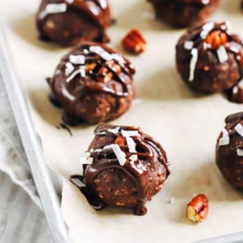 German Chocolate Protein Brownie Bites- packed with all of the delicious flavor of German Chocolate Cake, these brownie bites are made with wholesome ingredients...