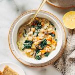 Next add the kale (or spinach) and potatoes. Cover and cook for 3 minutes more. Pour in the broth (start with 2½ cups then add ½ cup if needed) and simmer until potatoes are tender, for about 10-15 minutes.