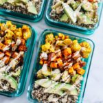 Once vegetables are cooled, arrange them in 4 separate bowls with cooked quinoa. Sprinkle with salt & pepper. Seal and refrigerate until ready to serve. Store avocado and tahini dressing separately.